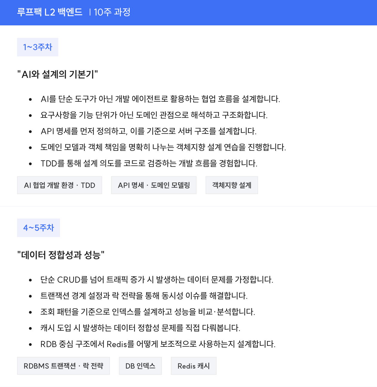 이직 준비를 하면서 자바 스프링 스택을 쓰는 회사로 옮기고 싶다는 목표는 분명했는데, 정작 나는 스프링을 쓰지 않는 환경에서 일하고 있다 보니 성장 방향이 꽤 막막했다. 제대로 해보자는 마음은 계속 있었지만 퇴근하고 나면 무엇부터, 어떤 순서로, 어느 깊이까지 해야 하는지 감이 오지 않았고 공부도 자주 끊겼다. 루퍼스 루프팩 백엔드 과정 2기를 선택했던 이유는 그 막막함을 해결하고 싶어서였다. 혼자서는 계속 의지에 기대게 되는데, 누군가가 정해준 구조 안에서 밀도 있게 해내고 싶었고, 성장을 체감할 수 있는 계기가 필요했다.